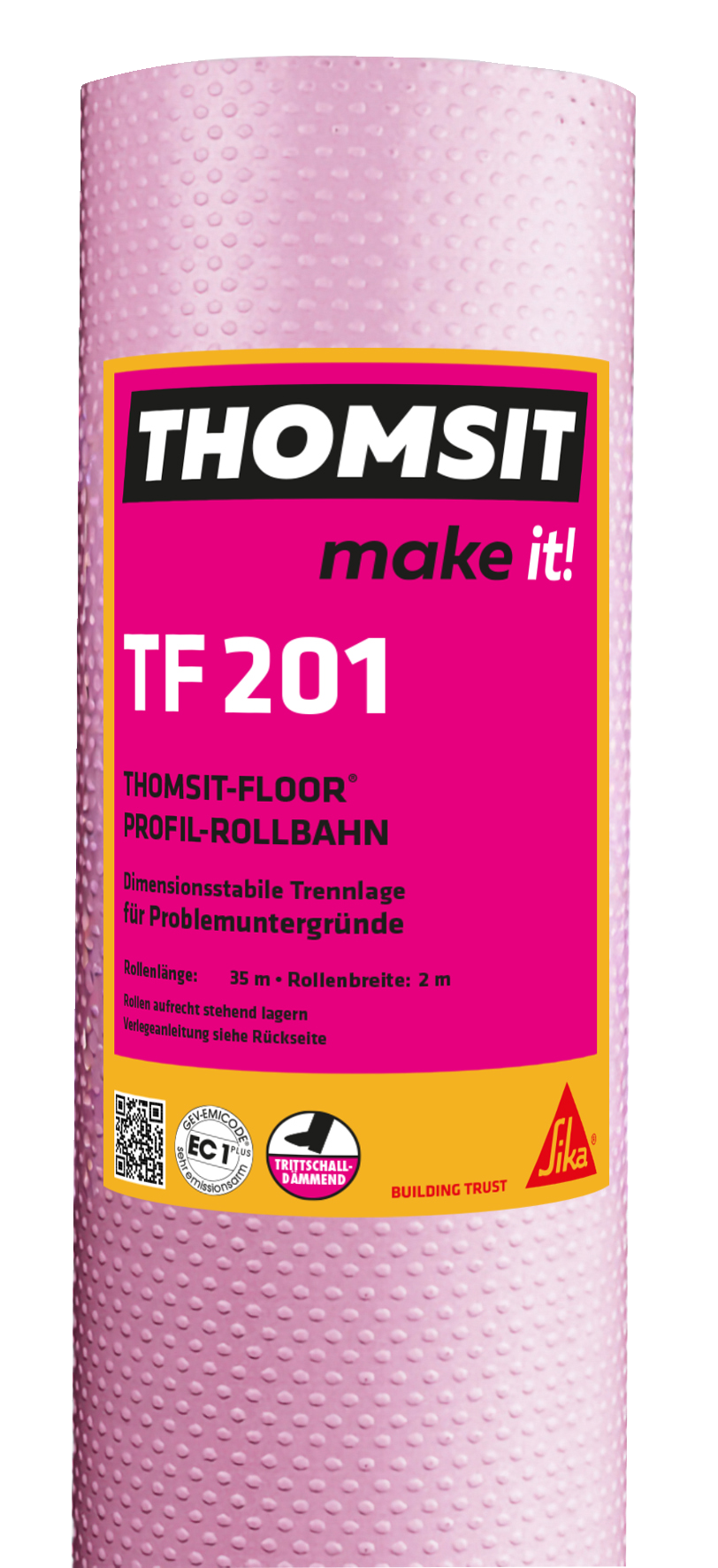 1. THOMSIT TF 201 Profil-Rollbahn auf dem bestehenden Untergrund dicht an dicht mit den Noppen nach unten auslegen. Zu den Wänden und weiteren aufgehenden Bauteilen mind. 10 mm Abstand halten. Die einzelnen Bahnen sind im Stoßbereich mittels handelsüblichen einseitigen Klebebands von der Unterseite her miteinander zu verbinden.